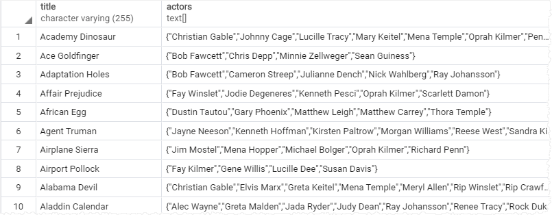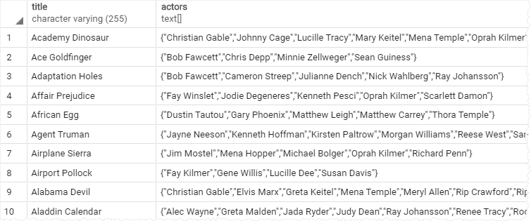 As you can see, the actors in each film are arbitrarily ordered. To sort the actors by last name or first name, you can use the ORDER BY clause in the ARRAY_AGG() function.